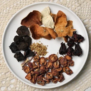 料包1:柴熏乌梅、山楂、陈皮、洛神花、桑葚、甘草