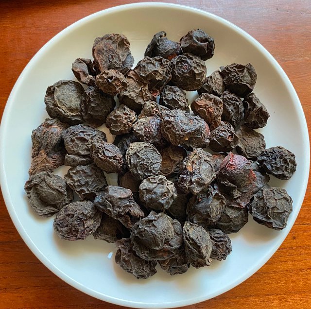 【制作方法】选用山上的野放青梅,经太阳下晒上几个月,变成乌黑的乌梅