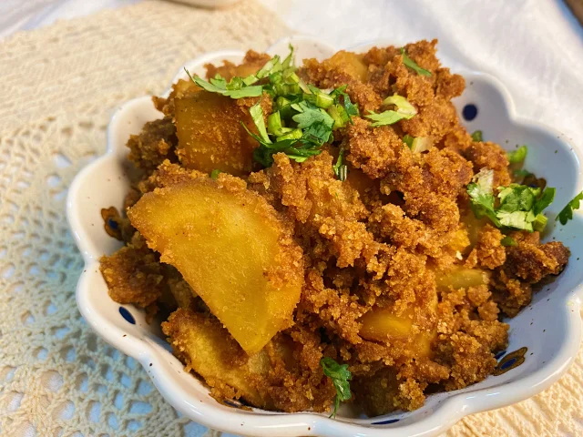 步骤二、拌好的蒸粉裹上土豆等要蒸的食材,上锅蒸。