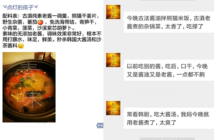 【特点】云南昆明永香斋酱菜传人,恪守家族传续之法,谨候时节,酿造的地道老酱。香辣,味道醇正。无酒、无防腐剂、纯净素食。